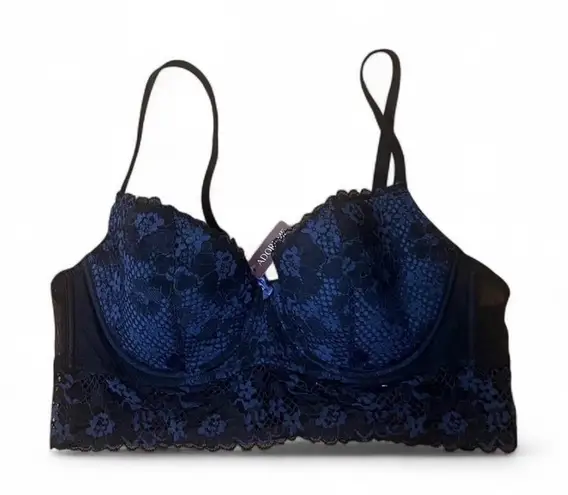 Chic lace bralette with intricate floral design. Features a striking black and blue color combinatio... Show more