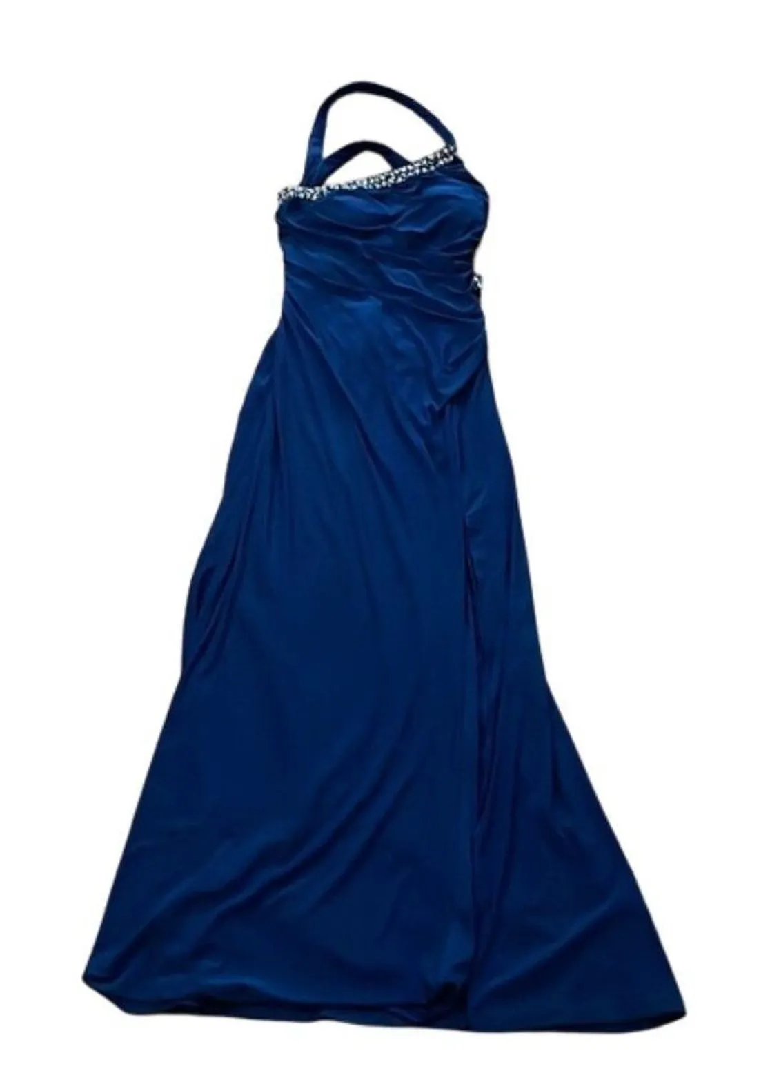 Blue, one shoulder, rhinestone embellished strappy back, 95% polyester, 5% elastane, formal evening gown, prom dress from Hailey Logon by Adrianna Papell in a women's size 7/8. Side zipper. Stretchy. High side slit. Spot clean. Approximate measurements shown in photos. In good pre-owned condition. party, formal, wedding, Mardi gras, ball, special occasion, prom, junior