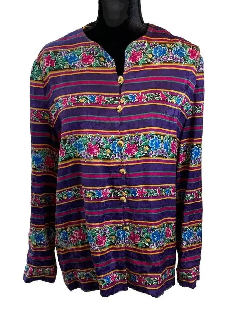 Adrianna Papell 12 Silk‎ Hook & Eye Button Colorful Floral Shirt Granny Boho VTG Purple - $25 - From Andrea