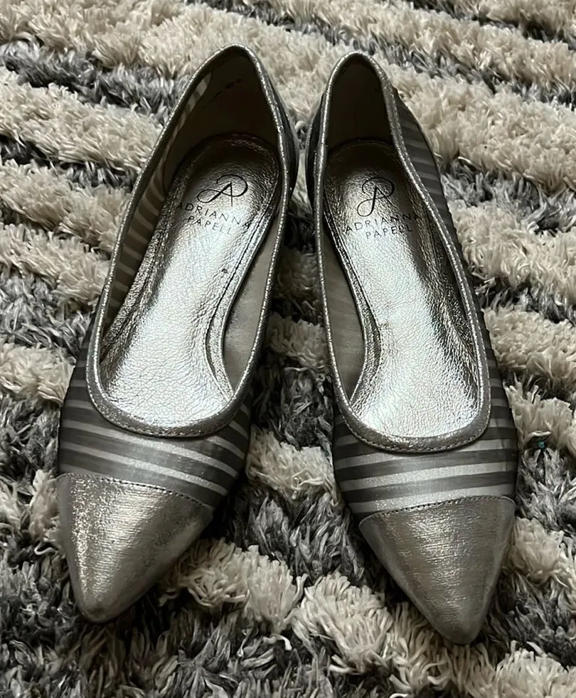 • used • pointed toe • striped sides • clear stones on heels (one missing) • leather sock • scuff on... Show more