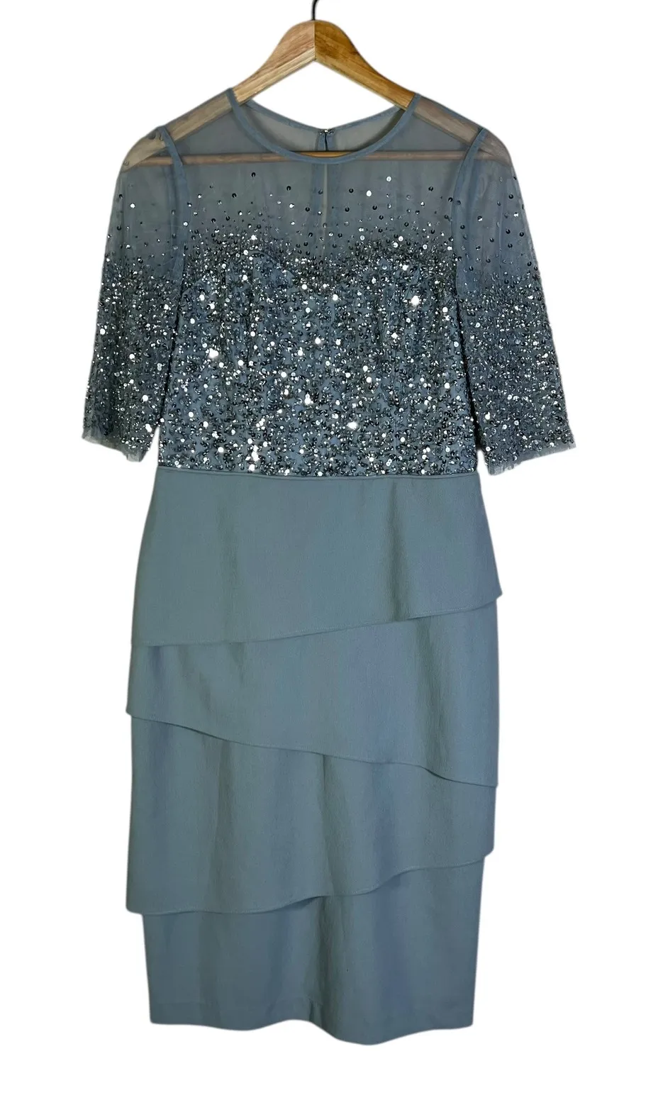 An elegant Adrianna Papell sheath dress in a soft light blue hue. This exquisite piece features a sh... Show more