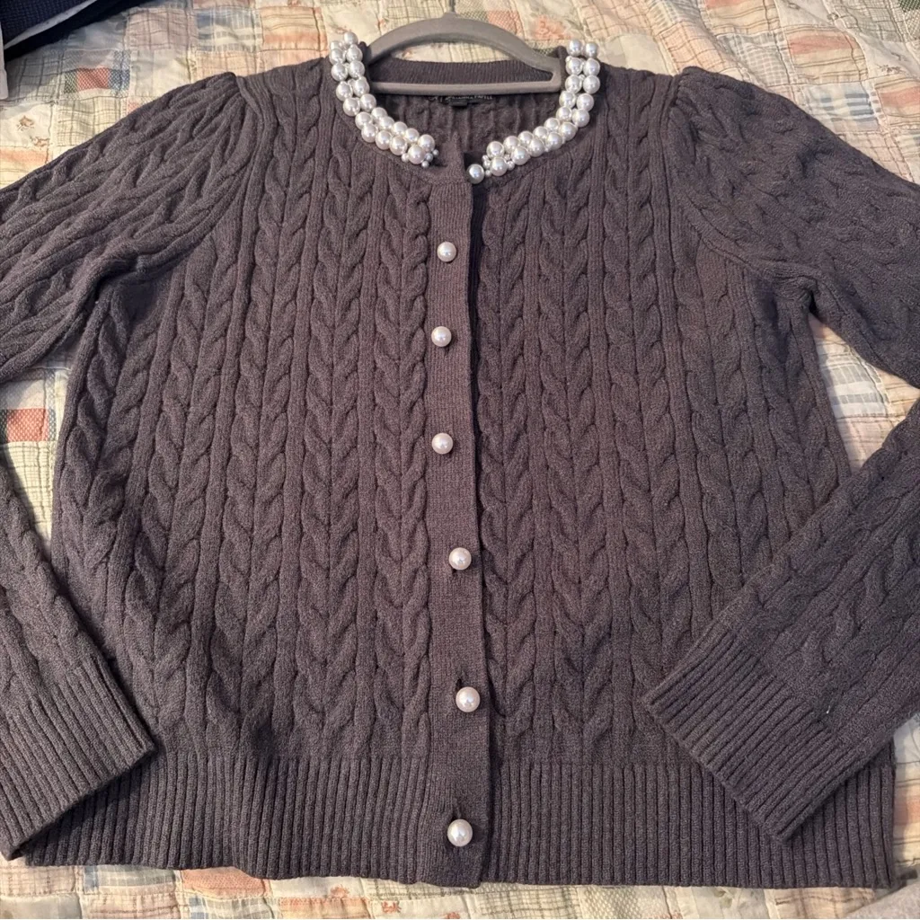Chic cable knit cardigan with pearl button details. Elegant design by Adrianna Papell.