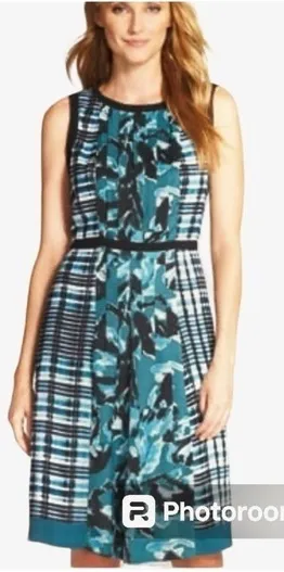 Adrianna Papell Teal Blue Mixed Print Pleated Fit and Flare Dress ~ beautiful soft pleats down fron... Show more