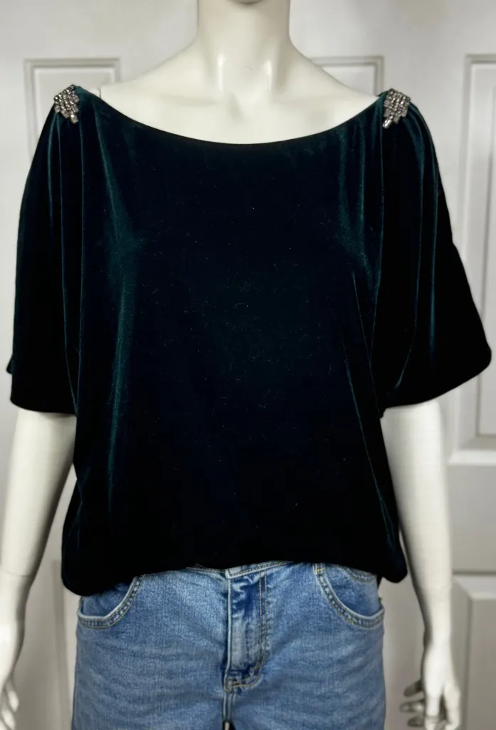 Chic hinter green velvet blouse with elegant shoulder embellishments. Perfect for evening wear blous... Show more