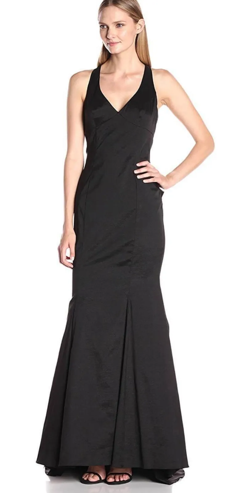 This stunning floor length dress efatures sleeveless V-neckline and form fitting bodice. The back ha... Show more