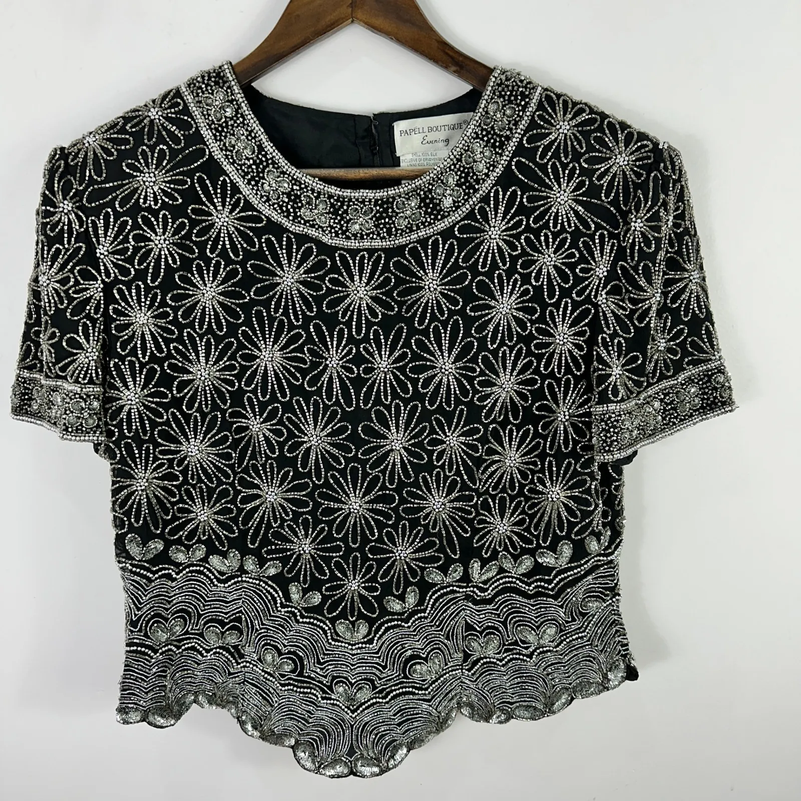 Papell Boutique Silk Beaded Top XL Black Silver 90s Evening Whimsigoth Mob Wife Stunning vintage Pa... Show more