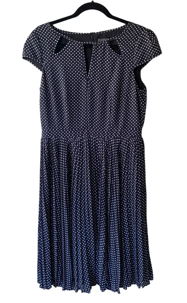 Adrianna Papell Pleated Black Dress White Polka Dots Peek A Boo Neckline Sz 10 No rips/tears/stains.... Show more