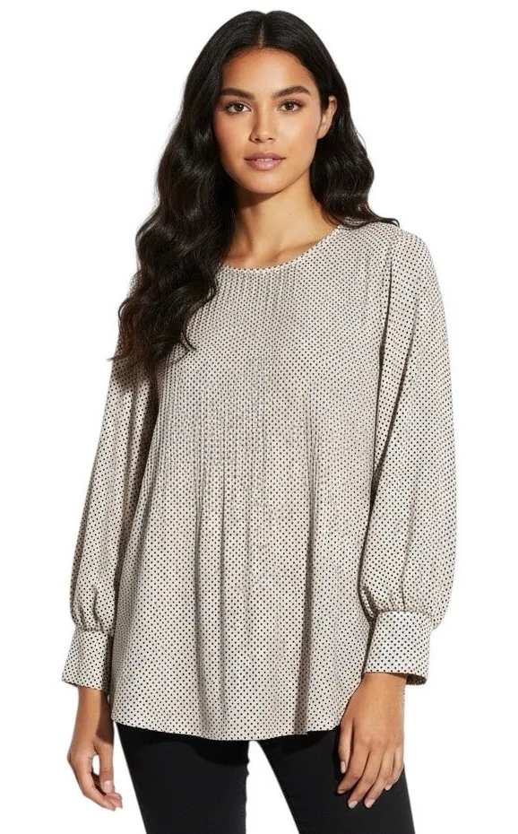 Keyhole neck closure with button Round Neckline Pleated knit Fabric Relaxed fit 93% Polyester, 7% El... Show more