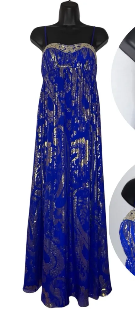 Aiden Mattox Silk & Metallic Gold Gown Royal Blue in color with Metallic Gold Floor length Dress S... Show more