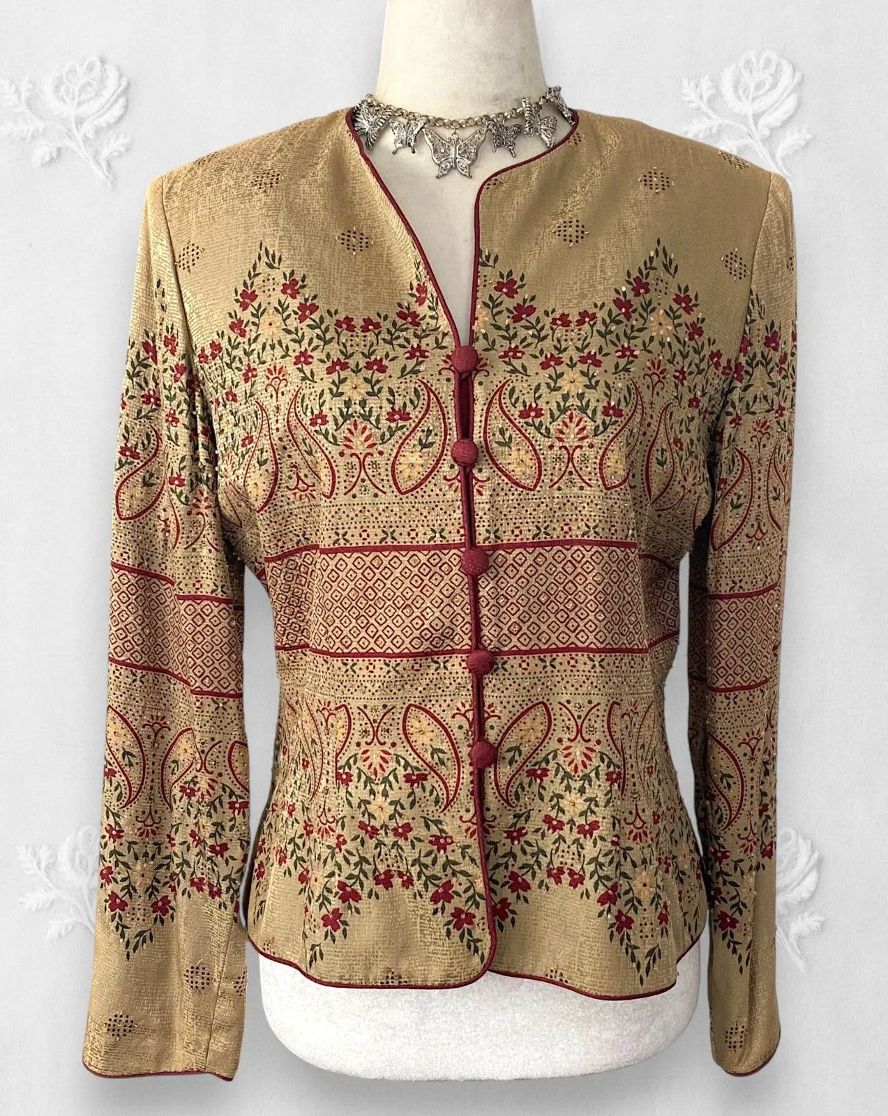 Whimsygoth Beaded Silk Blazer Jacket ༓ Brand: Papell ༓ Size: 6 P / S ༓ gold brown 100% silk jacket, burgundy red trim and buttons, intricate floral beading and embroidery ༓ button closure, shoulder pads, very good condition apart from very few loose threads / beads ༓ such witchy whimsical whimsygoth vibes Measurements: ༓ shoulders : 15.5" ༓ pits: 19" ༓ length 21.5" Tags: #cozy #y2k #coquette #cottage #boho