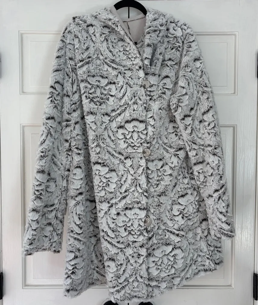 Elevate your winter wardrobe with this luxurious Adrienne Landau faux fur coat, designed in a soft cream-beige tone with subtle gray and white accents. This reversible hooded jacket offers two elegant looks in one — a plush faux-fur side for cozy evenings out, and a smooth fabric side for a more classic finish. Features button closure, side pockets, and a longline silhouette that flatters and keeps you warm through the cold months. Perfect for holiday events, evening wear, or stylish everyday layering. Details: • Brand: Adrienne Landau • Size: Women’s 1X (Plus Size) • Color: Cream Faux Suede, Gray/White Faux Fur • Reversible Design • Faux Fur Outer Shell: 100% Polyacrylates • Inner Shell: 100% Polyester • Button Front Closure • Two Pockets • Excellent preowned condition, no notable flaws • Retail is $475 Flatlay Measurements (approximate) Chest 25.5 inches Length 37 inches Sleeve from underarm 20.5 inches Waist 26 inches Tags: winter, coat, jacket, adrienne landau, fur, elegant, black tie, going out, night, day, snow, holiday, Adrienne Landau coat, faux fur jacket, reversible winter coat, plush hooded coat, elegant outerwear, plus size fashion, holiday style, cold weather essentials, snow coat, luxury faux fur