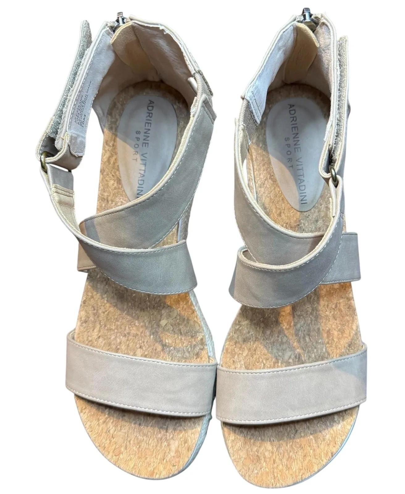 Brand: Adrienne Vittadini Sport Style: Cape Ann (AV-CAPE ANN) wedge sandals with back zipper Gender/Size: Womens US 10M (EU 42); tag also reads 10/42 M/W Color: Taupe/light beige upper with natural cork footbed Materials: Cork sock footbed; balance man-made materials Design features: Crisscross ankle straps, ankle cuff, espadrille-style jute trim, cushioned cork insole, rubber outsole Branding/Labels: "ADRIENNE VITTADINI SPORT" in footbed; outsole branded "Adrienne Vittadini" Inner markings: AV-CAPE ANN; 10M; 10/42 M/W; C27041 CBTK12; HK; Made in China Special notes: Versatile neutral color, comfortable wedge/platform profile; please review photos for details.