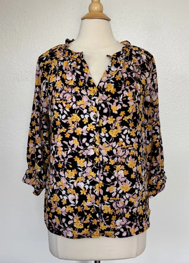 . Size medium. Brand is Adrienne Vittadini. One button hole has fraying. 7.7 oz Measurements were taken with the item laying flat across the front: Armpit to armpit: 20” Length: 24”