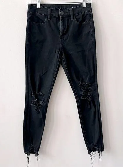 AE The Dream Jean Hi Rise Black Jeggings with distressed knee rips, frayed hem. Size 4 SHORT Excell... Show more