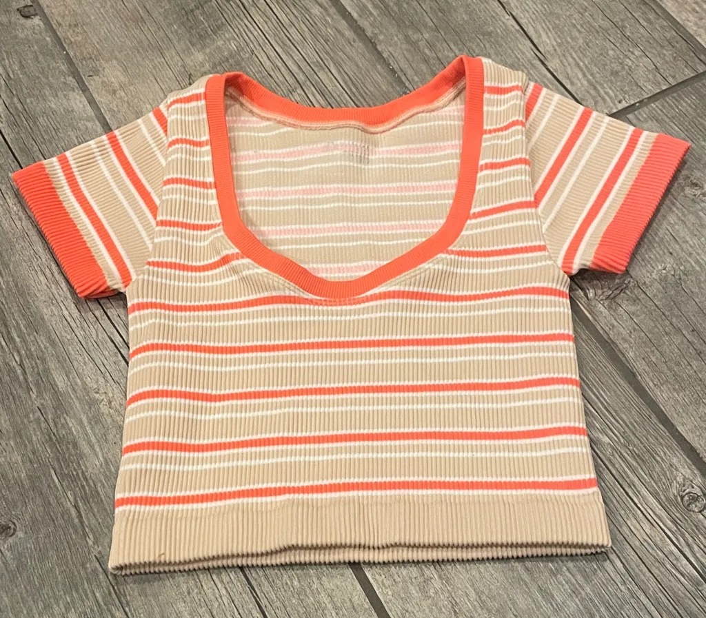 Stylish striped crop top featuring orange accents. Perfect for casual wear or the gym, Aerie size XS