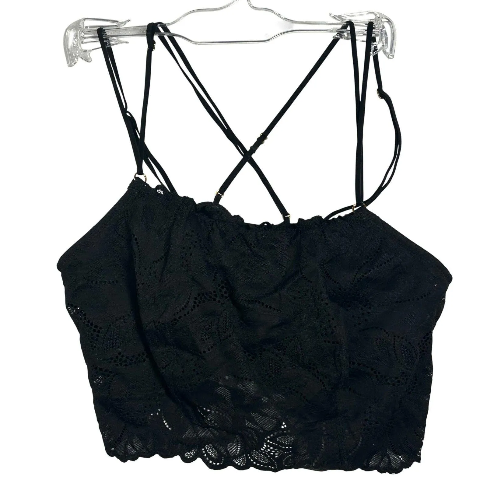 Aerie black lace cami crop top bralette. Features intricate floral lace overlay with a scalloped hem... Show more