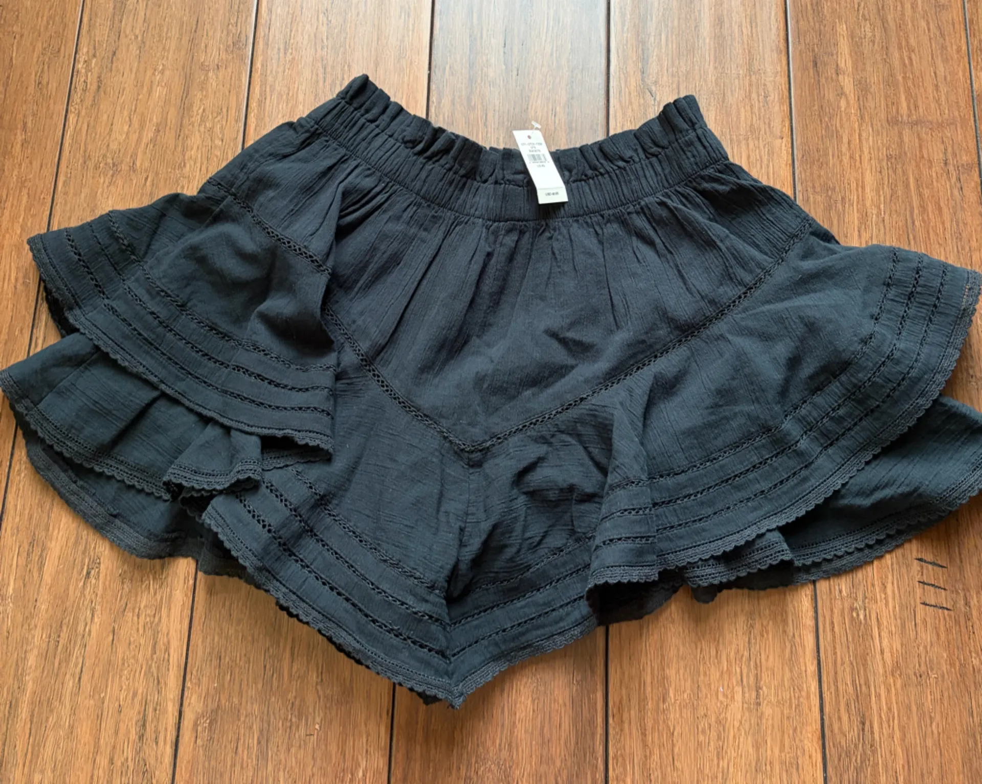 Chic black mini skirt with ruffled hem, lace details, and built in shorts. 100% cotton! Loveshackf... Show more