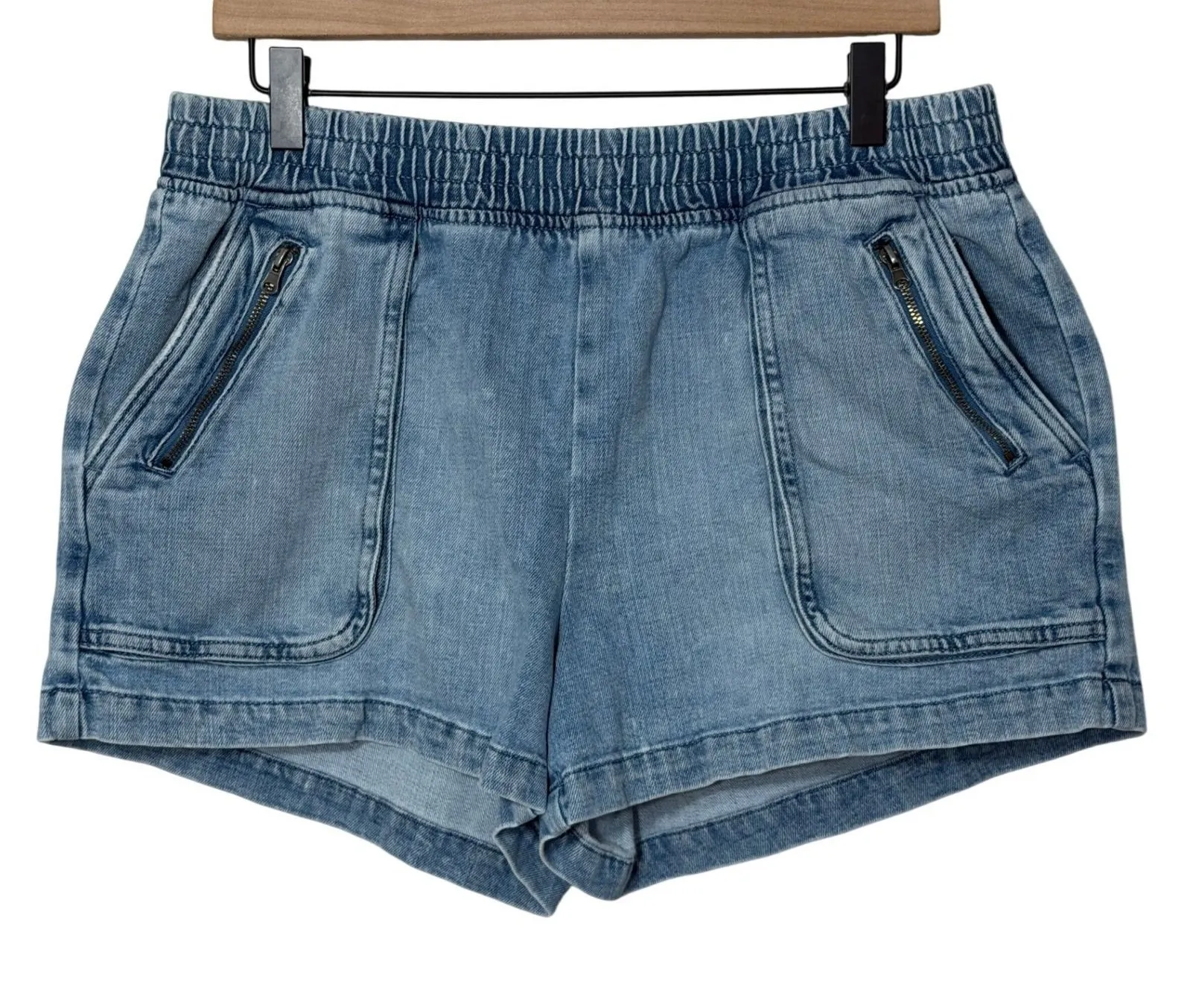 Aerie light wash denim shorts with an elastic waistband and functional zipper pockets, cotton/poly b... Show more