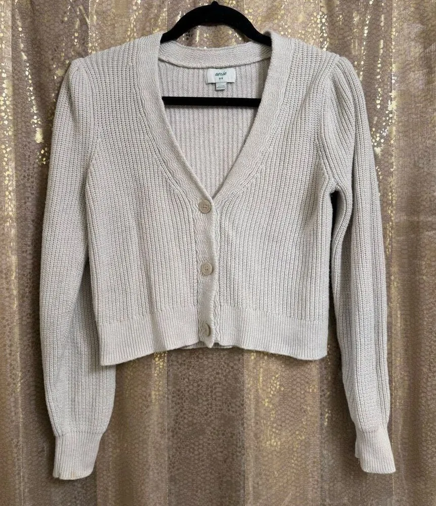 Aerie Cropped Cardigan Cream Beige Chunky Knit Balloon Sleeves Medium Used condition, smoke and pe... Show more