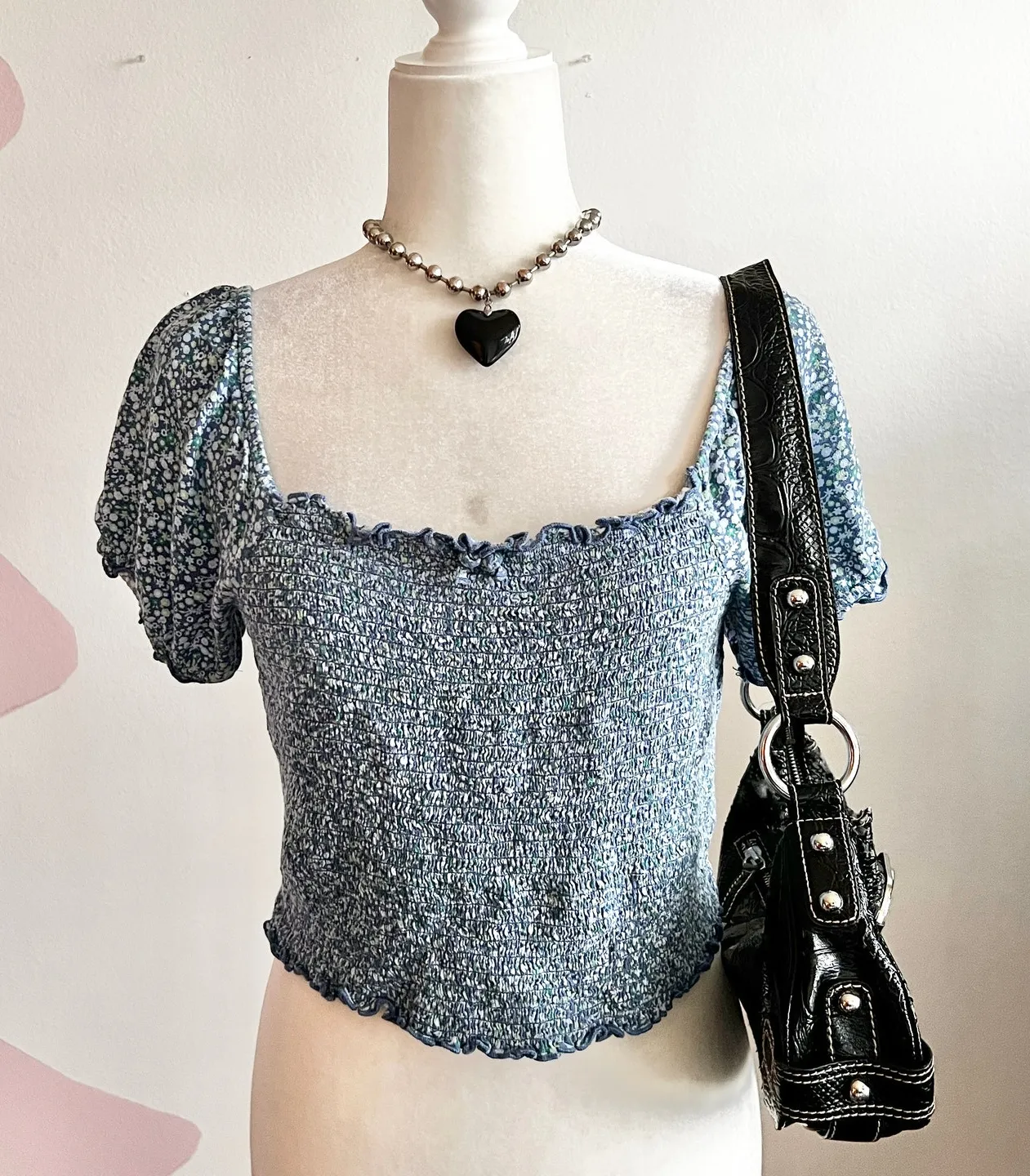 Aerie Floral Smocked Puff Sleeve‎ Cropped Top Blue Large Prairie Coquette - $15 - From Kenia