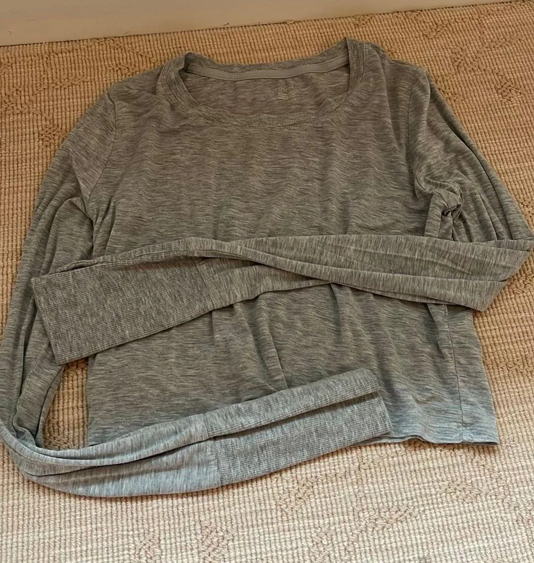 gray long sleeve, with thumb holes, extremely thing and super soft