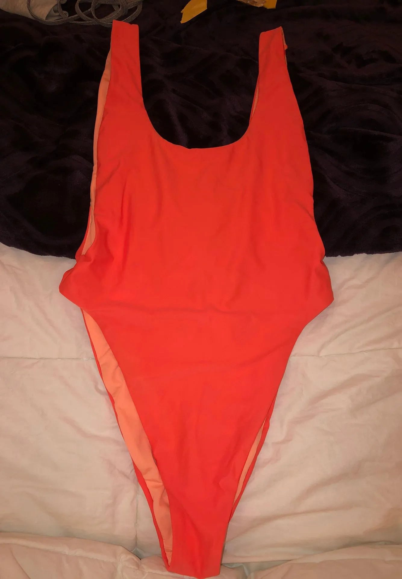 Bright orange high waisted swimmy! The fabric is thick and in really great condition. It scoops in t... Show more