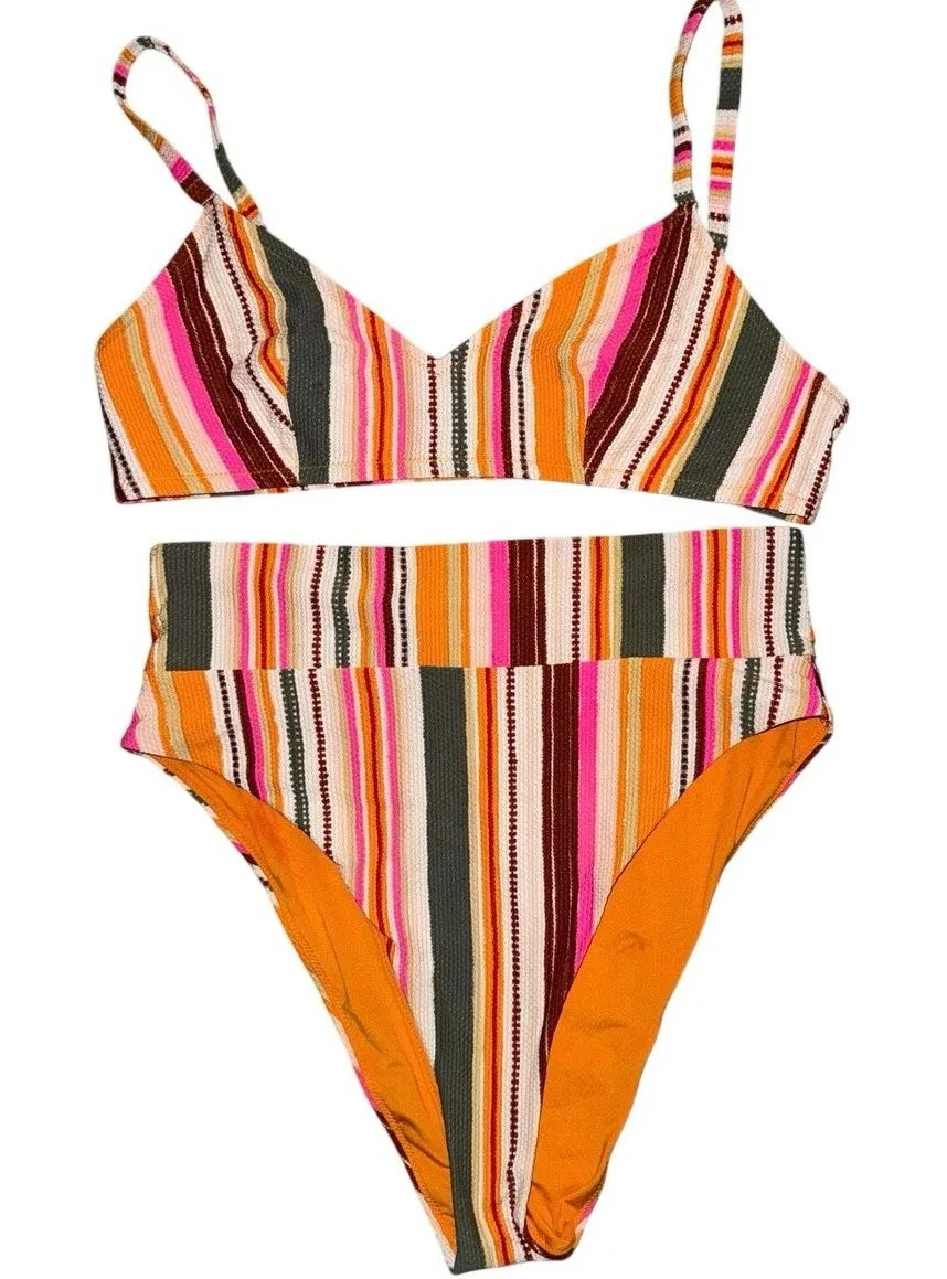 multicolor striped bikini set from Aerie. It is a high-waisted, high-cut cheeky style featuring a ribbed texture and a mix of pink, orange, green, and cream stripes.