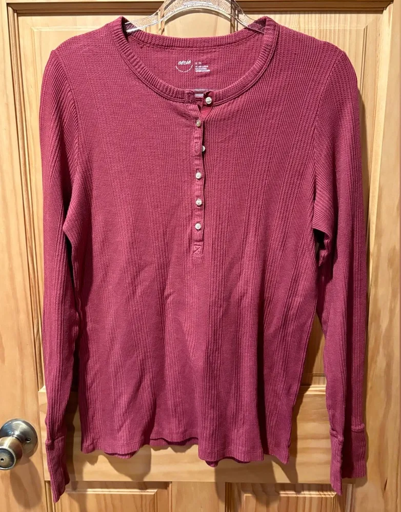 This Aerie Long Sleeve Waffle Knit Henley Top is a long-sleeve, rib-knit Henley shirt in a reddish-b... Show more