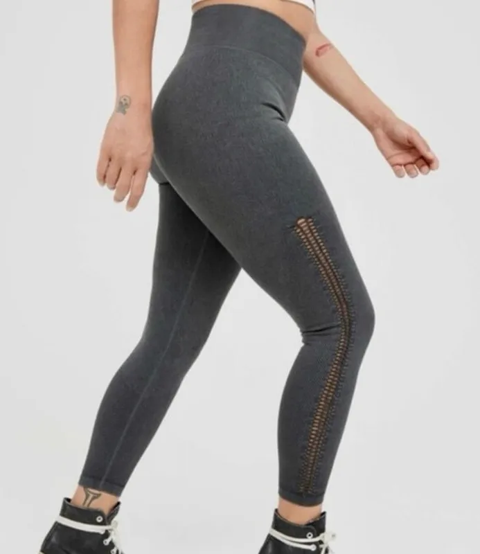 High rise Seamless design Petite fit Ankle length Macrame ladder cutout detail along legs Stretch kn... Show more