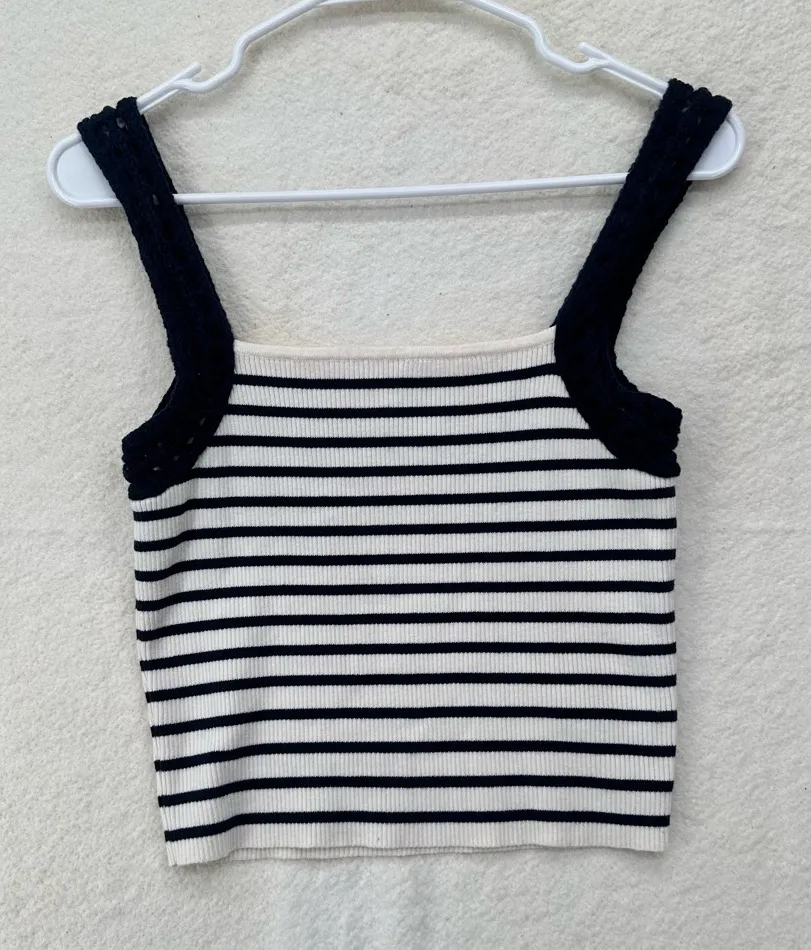 Size: M Measurements in pics -Sleeveless design -Scoop neckline -Solid navy trim at straps and armh... Show more