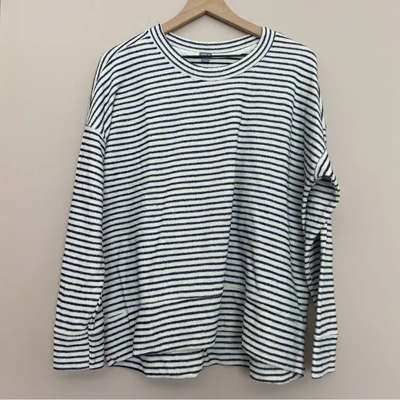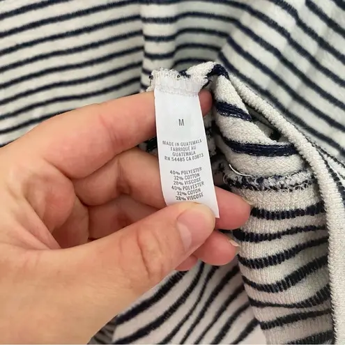 Good used condition. Navy and white stripes. Pullover design for beach days/nights. Sort of a terry... Show more