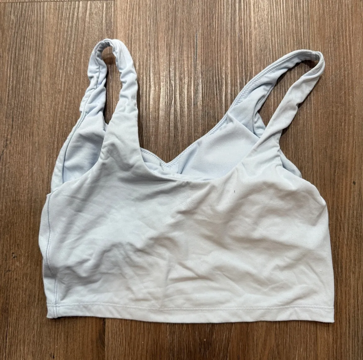 Light blue seamless sports bra tank top from Aerie Offline. Features a V-neckline with supportive straps and a cropped length. A subtle sunburst logo is embossed on the front. Perfect for yoga workouts or casual everyday wear. Type: Bra Band Size: S Support Level: Medium Style: Sports Bra Features: Stretch, V-Neck, Unpadded, Unlined Performance/Activity: Yoga, Pilates, Athleisure, Gym & Training Fabric Type: Knit Strap Type: Wide Strap Closure: Pullover Accents: Logo Underwire Type: Wireless Department: Women Pattern: Solid Keywords: Aerie, activewear, athleisure, workout, yoga, seamless, cropped, loungewear, comfort, athletic, sporty, summer, training