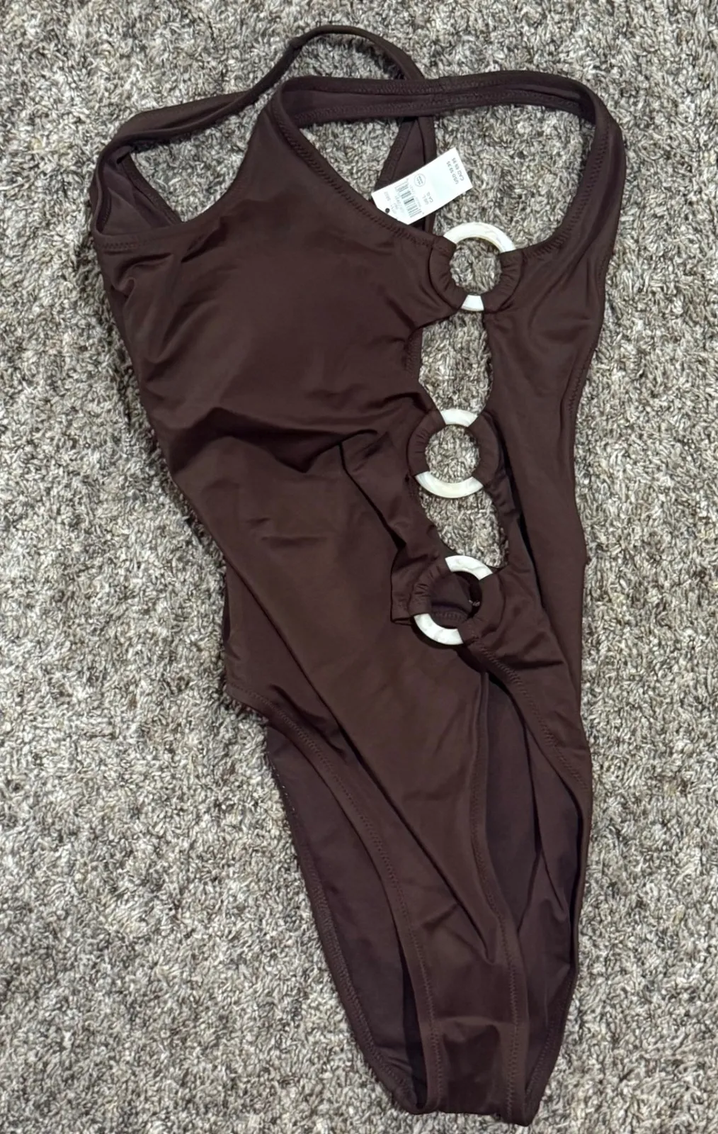 Aerie One Piece Cheeky Swimsuit Brown Ring Detail UPF 50 Built in bra size Large NEW with tags Measu... Show more