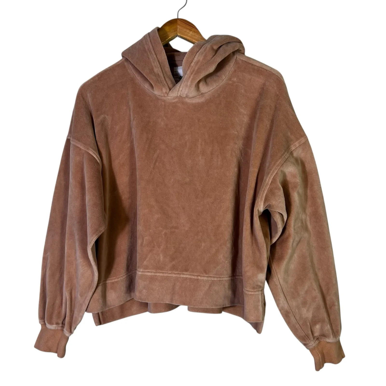 Velour fabric Pullover closure Attached hood Knit construction Relaxed fit Polyester blend material... Show more