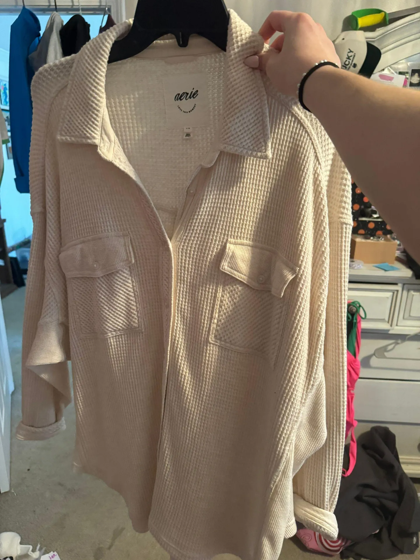 Waffle knit so comfy Dress up or down Large but fits medium , I always tuck it in