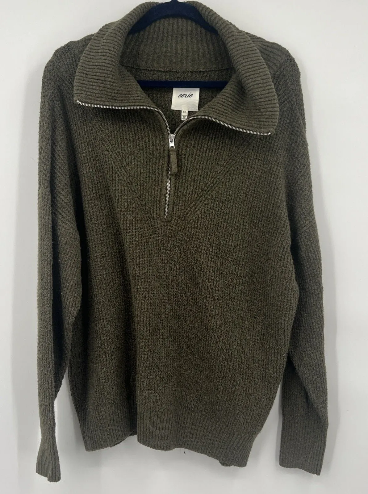 The Aerie Waffle Knit Sweater is a stylish and cozy women's garment in size small, featuring a solid green color and an oversized fit. This pullover sweater is perfect for casual occasions during the winter, fall, and spring seasons. Made with a waffle-knit design and long sleeves, it offers a comfortable and trendy look that can be easily machine washed for care. The ribbed cottage style adds a touch of charm to this must-have addition to any woman's wardrobe.