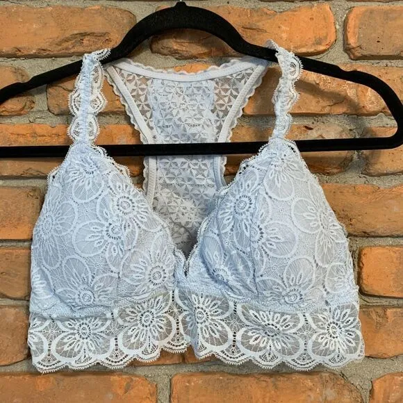 Beautiful Aerie lace bralette in a soft light blue shade. Features an elegant floral lace pattern th... Show more