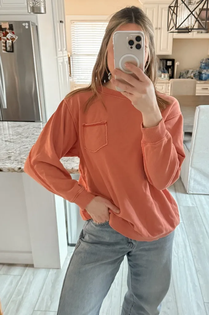 Aerie women’s pocket crewneck sweatshirt in a soft peach/coral color. Relaxed casual fit with ribbed... Show more