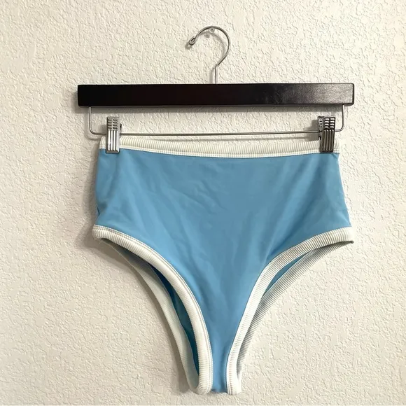 Womens Size Small Bikini Swim Bottom Blue White Ribbed Trim High Waist Cheeky Good Pre Owned Condi... Show more