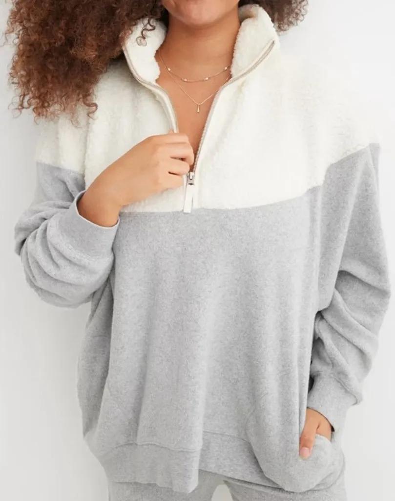 Aerie women’s size XXS pullover. Sweatshirt features a polyester Sherpa cream fabric on upper body;... Show more