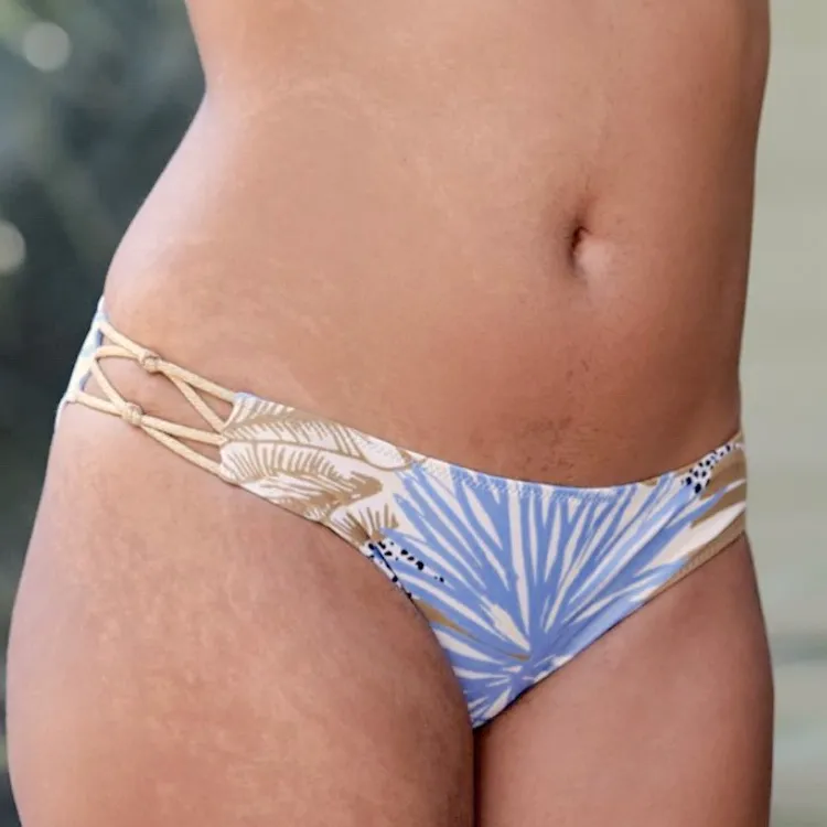Aerie Womens full coverage bikini swim bottoms, blue and tan tropical print pattern, gold side knot... Show more