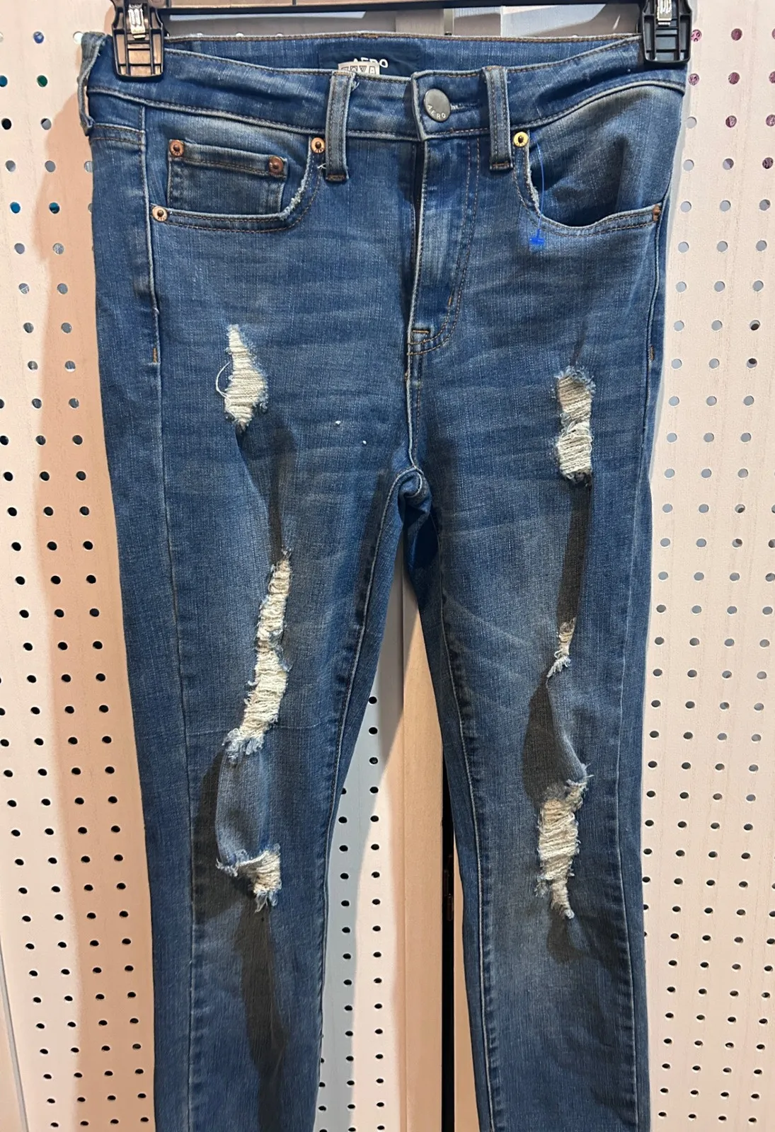 Stylish AERO high rise jegging jeans for a modern, edgy look. These jeans feature a comfortable, form-fitting silhouette. Distressed details add a touch of rebellious style, with rips and faded areas enhancing its unique character. A classic blue wash ensures versatility, while the high-rise design flatters the figure. Perfect for casual outings, concerts, or everyday wear when you want to make a statement. Style: Jegging Department: Women Fabric Wash: Medium Accents: Button Features: Stretch, Pockets, Lightweight, Comfort Type: Jeans Waist Size: 26 in Fit: Slim Pattern: Solid Rise: High (Greater than 10.5 in) Fabric Type: Denim Material: Cotton, Polyester, Spandex Closure: Button, Zip - I ship in 1-2 days. - The more you bundle, the more free items you get! - Shop my closet for: jeans, workout, athletic, shoes, career, resort, vacation, swim, fall, work, lounge, cashmere, chic, boho and brands such as: Nike, Athleta, Torrid, Knox Rose, Anthropologie, Lulu, For Love, Entro, LOFT, Lilly