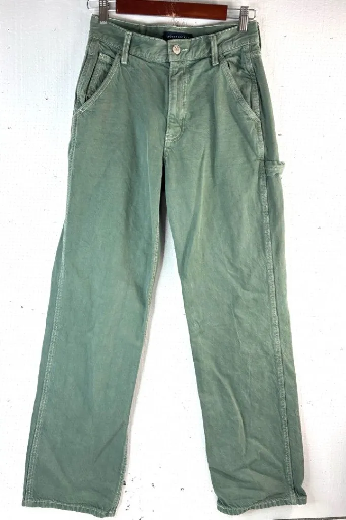 Excellent pre-owned condition Chic green baggy leg jeans with painters strap. Comfortable fit. Per... Show more