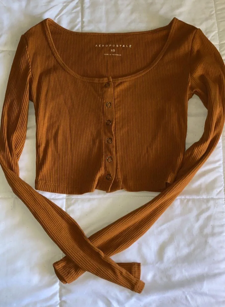 • Good Condition (never worn) • A pretty brown/orange color button down long sleeve cropped • Stretc... Show more