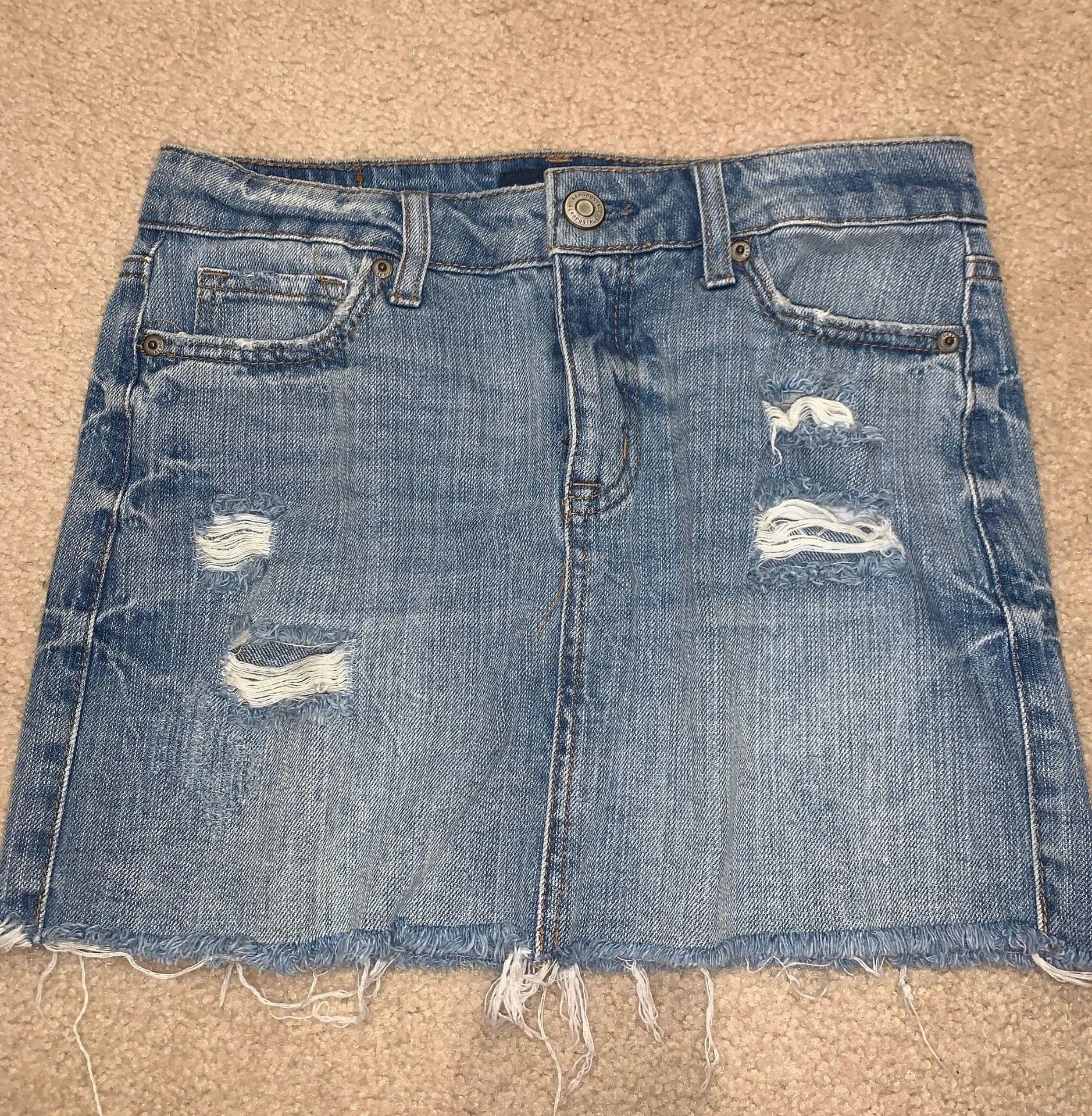 Mini zip up denim skirt with rips and distressed detail, worn once. Is in perfect condition!