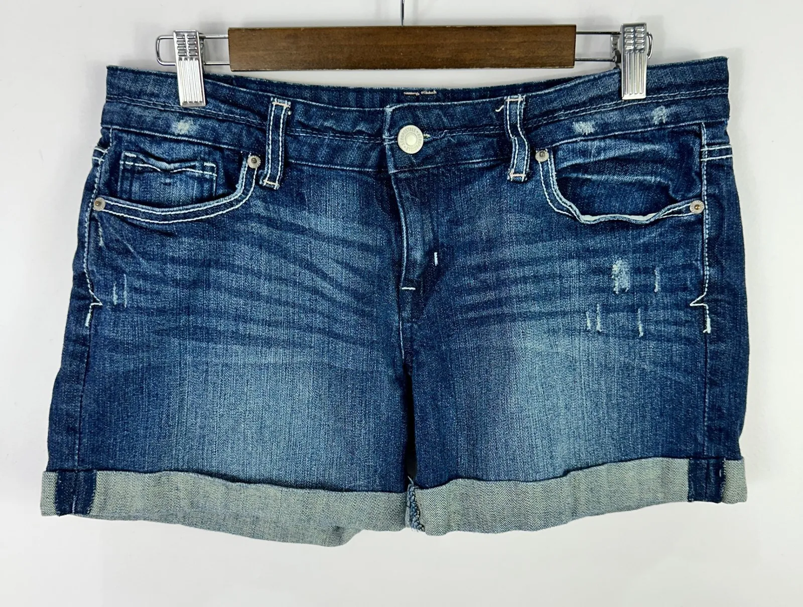 Aeropostale distressed denim shorts in size 9/10 with cuffed hems. Medium wash with whiskering, fadi... Show more