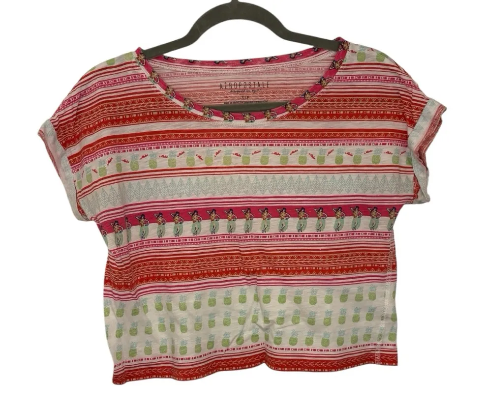 This Aeropostale top features a vibrant pink and red color palette in a boxy, cropped t-shirt style.... Show more