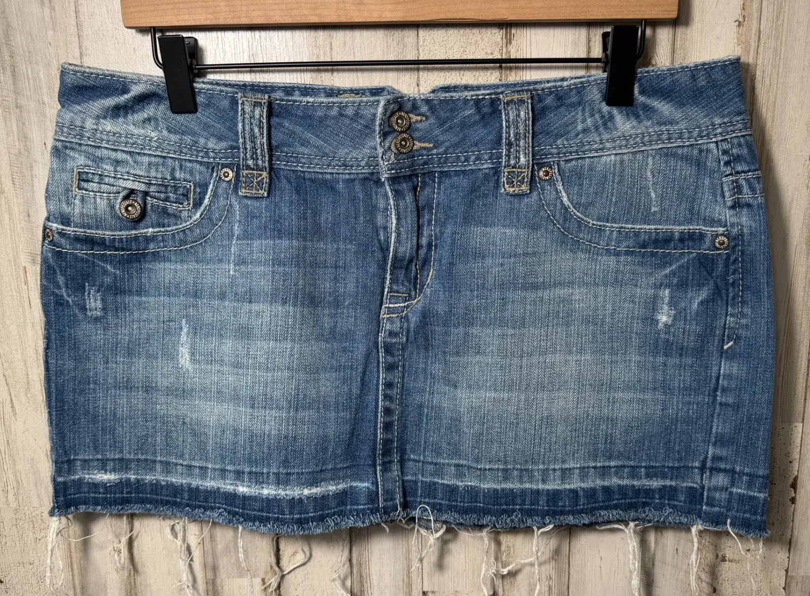 - great preowned condition. womens size 11/12. 100% cotton. medium wash denim. distressed. raw hem.... Show more