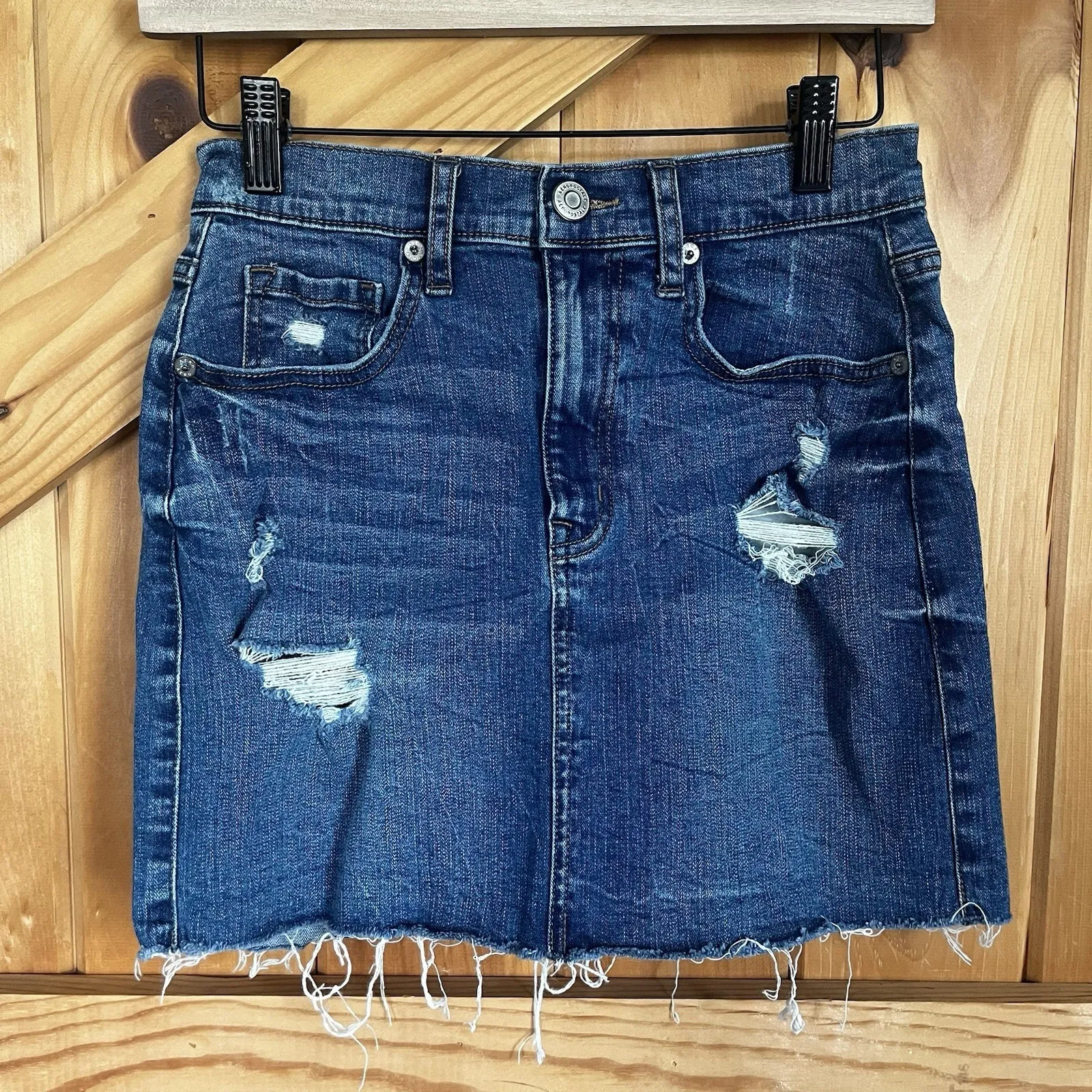 Aeropostale woman's size 2 high rise denim mini skirt 5 pockets Raw hem Preowned