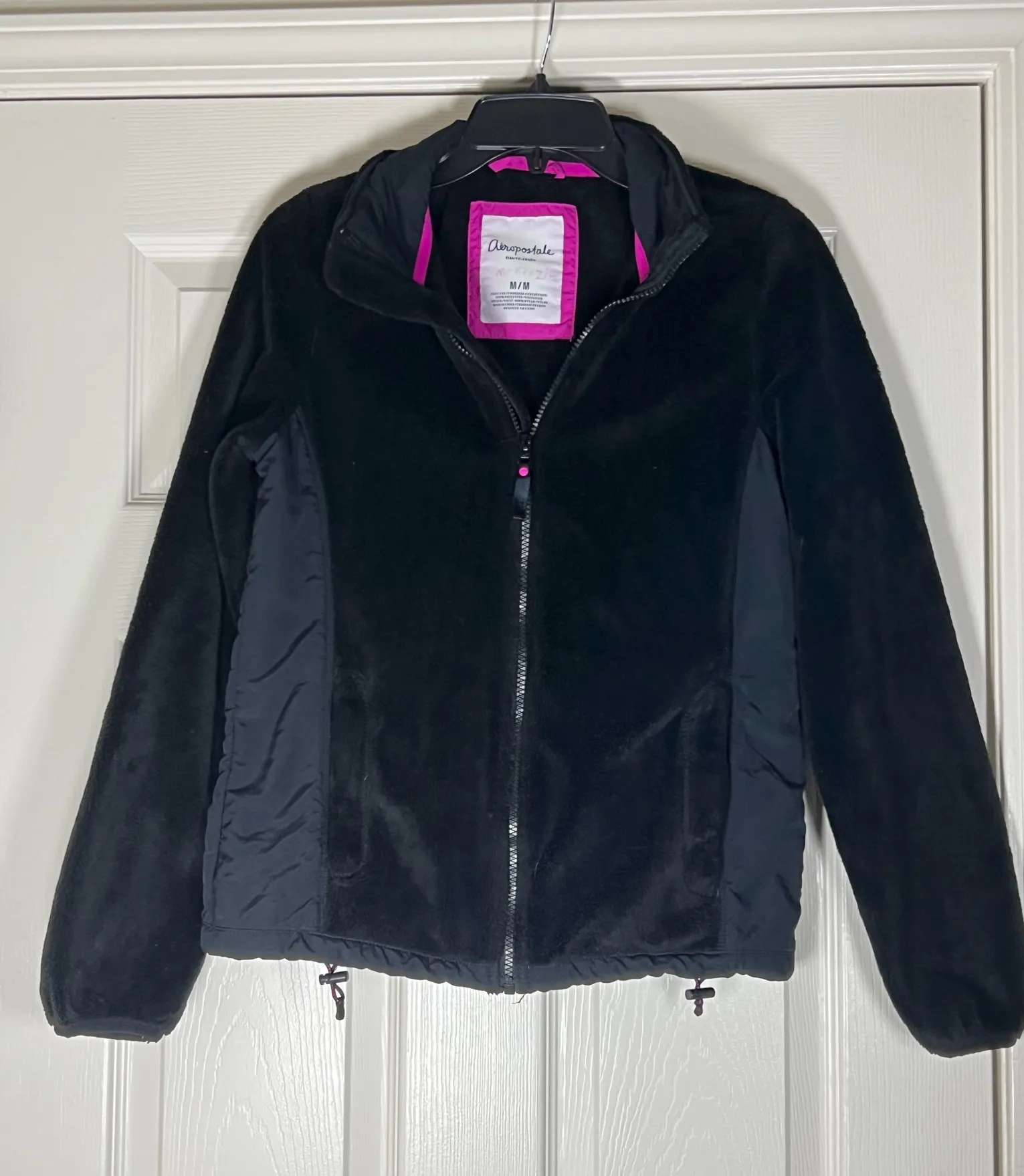 The Aeropostale Women's Black Full Zip Fleece Jacket with Fuchsia Accents in size M is a stylish and... Show more